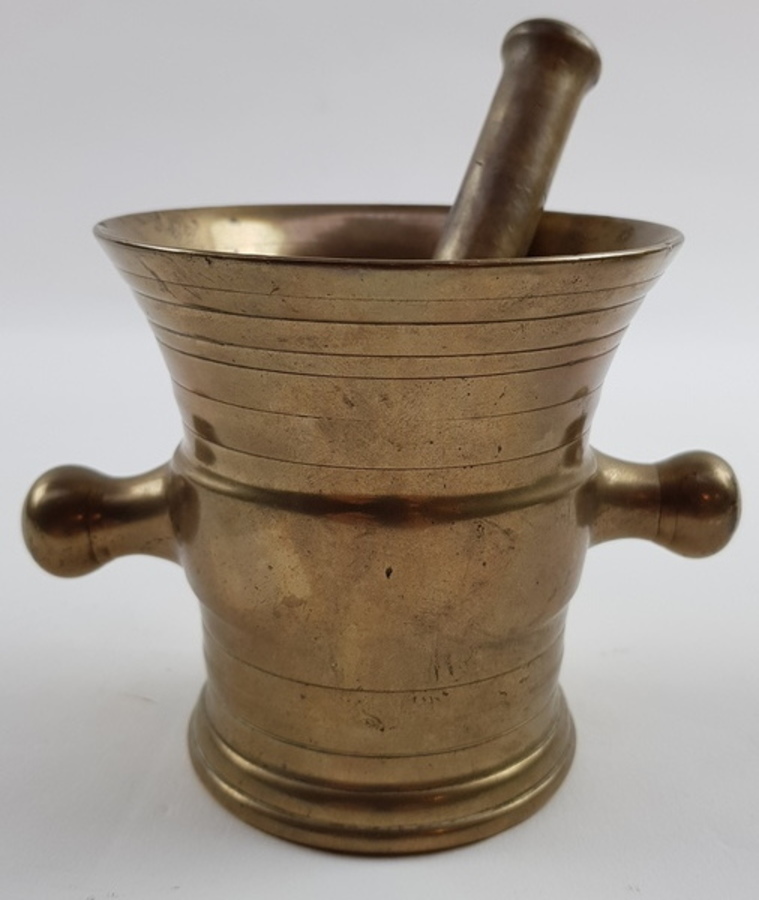 Messing vijzel en een tinnen klepkan, 19e en 20e eeuw