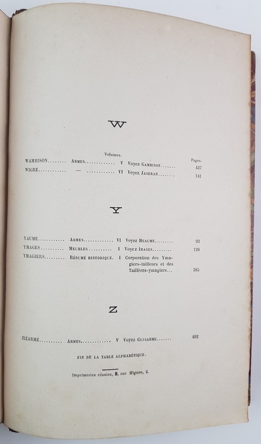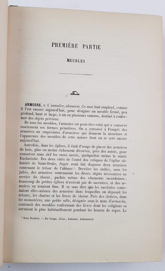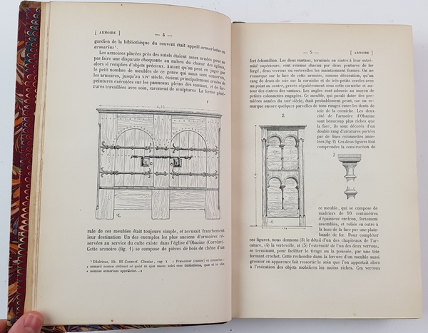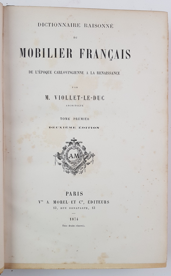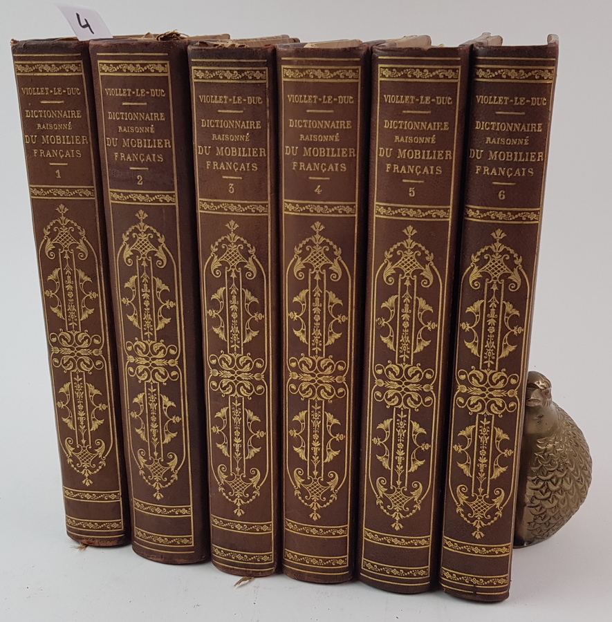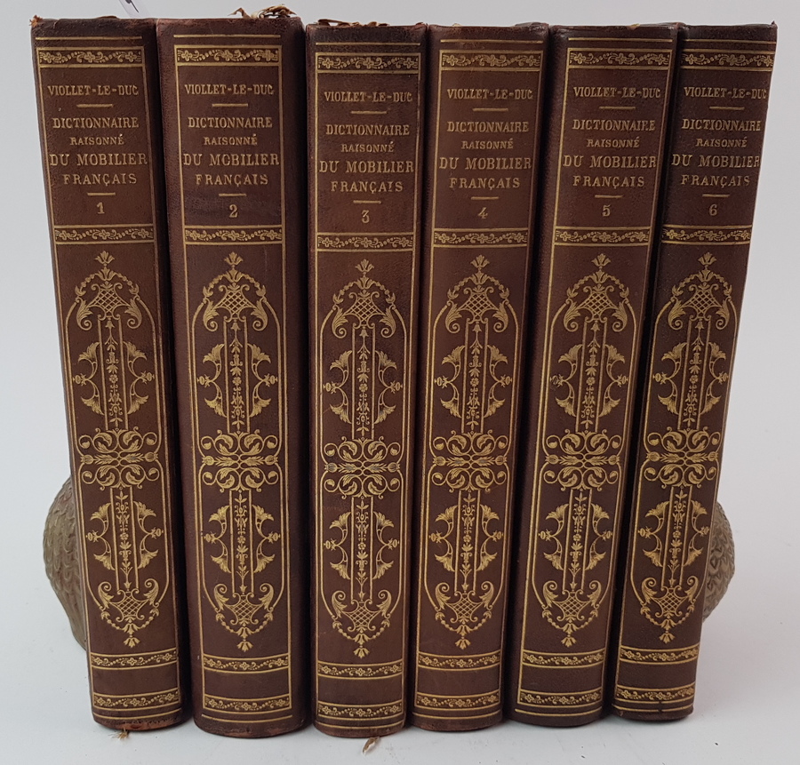M. Viollet-Le-Duc - Dictionnaire Raisonne du Mobilier Francais de l'epoque Carlovingienne a la Renaissance. 6 delen, complete set. Paris: A. Morel et Cie, Librairie Centrale d' Architecture etc., 1874. Uniform gebonden in halfleer met gemarmerde platten. Goudopdruk op de rug. Met platen, veelal in kleur; daarnaast met vele afbeeldingen in zwart-wit. Ca. 500pp per deel. 4to (25x16,5 cm). Fraaie set. |