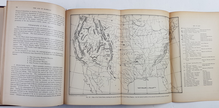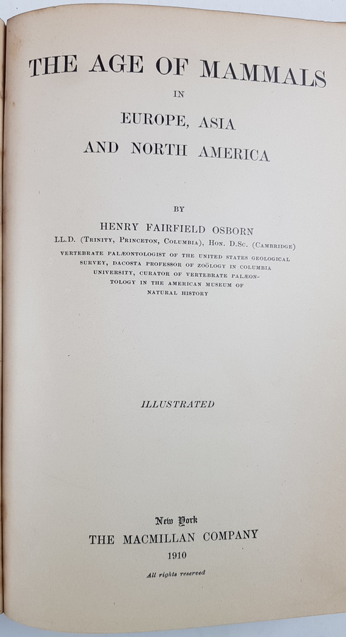 Henry Fairfield Osborn - The Age of Mammals in Europe, Asia and North America. New York: The Macmillan Company, 1910. Gebonden in linnen met goudopdruk op voorplat en rug. Met vele illustraties en een uitvouwbare kaart. Xvii, 635pp. 8vo. |