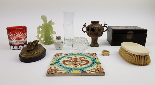 Lot diversen (10+) waaronder een relikwie. 19/20e eeuw. Waaronder: speel fiches, borstel( ivoor), serpentine beeld( besch.) brons voet etc.