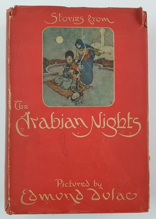 Edmund Dulac (illustraties); Laurence Housman - Stories from the Arabian Nights. London: Hodder and Stoughton, [1938 of eerder]. Gebonden in linnen met stofomslag. Gestempelde platten met goudopdruk op de rug. Met vele tipped in illustraties. 8vo (24x17 cm). 245pp.