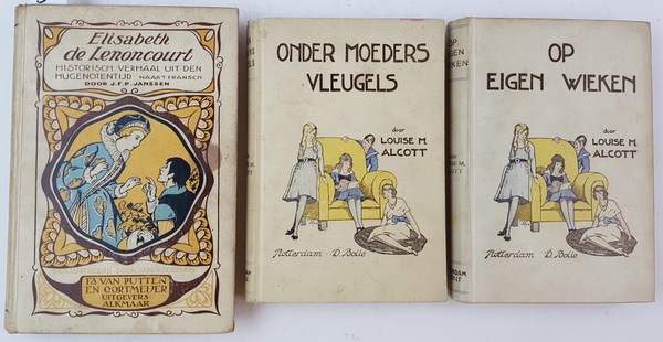 J. F. P. Janssen - Elisabeth de Lenoncourt. Historisch verhaal uit den Hugenotentijd, naar 't Fransch. Geillustreerd door Jan Wiegman. Alkmaar: Fa. van Putten en Cortmeijer, z.j. [ca. 1930]. 212pp. + 2 kinderboeken, door Louise M. Alcott.