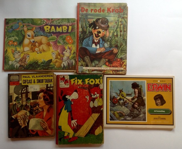 Bully Dog "De rode krab" uitgeverij Mulder, hardcover. Erwin, deel 1 "De banneling" 1973, tekst en tekening Hans Kresse, uitgeverij Unieboek, softcover. Walt Disney's Bambi, uitgave "Margriet" weekblad, met plaatjes, hardcover. Fix Foxi, 2e jaargang 1960, uitgeverij Nederlandse Rotogravure, hardcover. Paul Vlaanderen "Gifgas & Snuiftabak", beeldschermdetective, hardcover.