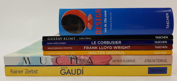 Een lot van 7 boeken over toegepaste kunst en design, waaronder een aantal boeken over architectuur. (O.a. Lloyd Wright en Le Corbusier). [Totaal 7].