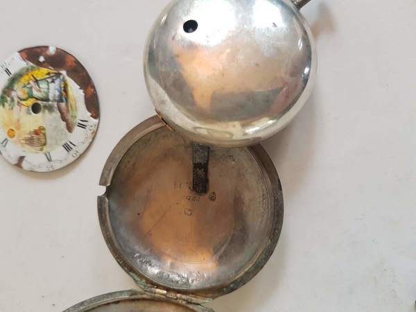 Zogenaamde knol dubbekle zilveren kast London jaarletter 1800 met geemailleerde wijzerplaat (incompleet beschadigd)