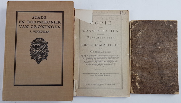 J. Vinhuizen - Stads- en Dorpskroniek van Groningen (1800-1900). Bolsward: A. J. Osinga, 1935. Gebonden in linnen. Hierbij 2 andere: (1): Copie van de Consideratien door Eenige Gevolmagtigden (...) in de Ommelanden. Groningen: Erven B. van der Kamp, 1891 (schaars!) en (2) Memorie van Informatien voor de Bedienden, Aangesteld tot weeringe der Sluikeryen in de Gemeene Middelen, over Holland en Westvriesland [2e helft 18e eeuw.]