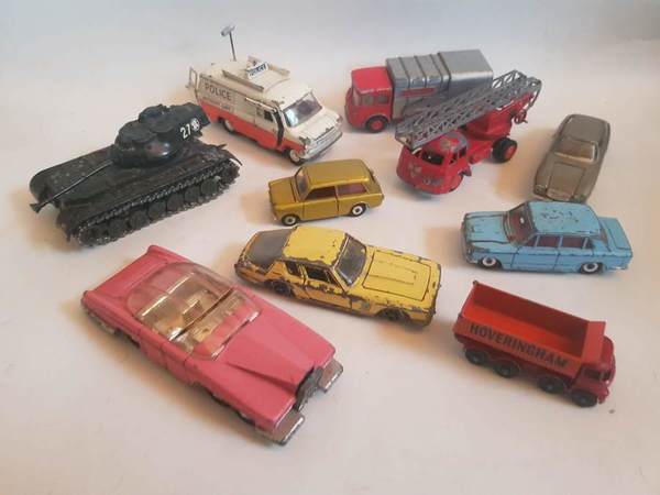 Thunderbirds lady Penelope auto, hierbij 8 andere modelen van o,a Dinky, Gama, Matchbox etc. (bespeelde staat)