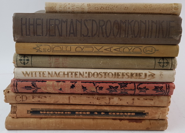 Een divers lot literatuur, veelal in Art Nouveau en Art Deco boekband. Onder andere A.M. de Jong - De Rijkaard en H. Heijermans - Droomkoninkje. [Totaal 9].