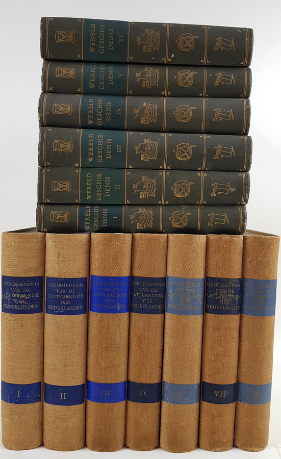 Prof. Dr. F. Baur e.a. (reds.) - Geschiedenis van de Letterkunde der Nederlanden. Antwerpen, Brussel: N. V. Standaard-Boekhandel; 's-Hertogenbosch: Teulings' Uitgevers-Mij, z. j. [ca. 1950]. 9 delen in 7 banden. Het (veel) later uitgegeven deel 10 ontbreekt. + Dr. J. W. Berkelbach e.a. - Wereldgeschiedenis. 6 delen, compleet. Utrecht, W. de Haan, 1951/1953. [Totaal: 13].