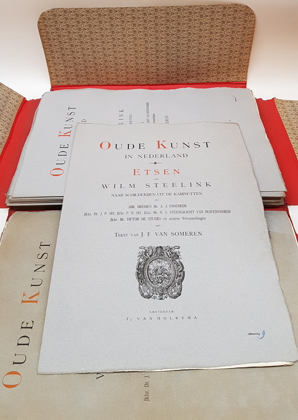 J. M. van Someren (tekst); Wilm. Steelink (etsen) - Oude Kunst in Nederland. Etsen (...) naar schilderijen uit de kabinetten van Abr. Bredius (...) Mr. Victor de Stuers en andere verzamelingen. Amsterdam: Van Holkema en Warendorf [ca. 1890]. 30 genummerde mappen (compleet). In elke map tekst en een ets beschermd door een Japans papiertje. Onder andere etsen aanwezig van werken van Vermeer, Rembrandt, Hals en Potter. De delen zijn samengebracht in een grote map, rood linnen met goudopdruk. De mappen meten ca. 60x45 cm; de rode verzamelmap 64x45 cm. Compleet. Schaars.