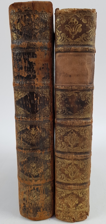 H. van Rijn - Oudheden en Gestichten van Vriesland, tusschen 't Vlie en de Lawers. Tweede deel. Hierbij: H. van Rijn - Oudheden en Gestichten van Kennemerland. Amstelland, Noordholland en Westvriesland. Eerste Deel. Met Kopere Platen. Leiden: Christiaan Vermey, 1721 en 1723. 2 incomplete sets. Beide delen gebonden in leer met ribben op de rug en een vervaagd titelschildje. 1 uitslaande plaat in Kennemerland, de andere missend. 560pp, bladwyzer; 568pp, bladwyzer.