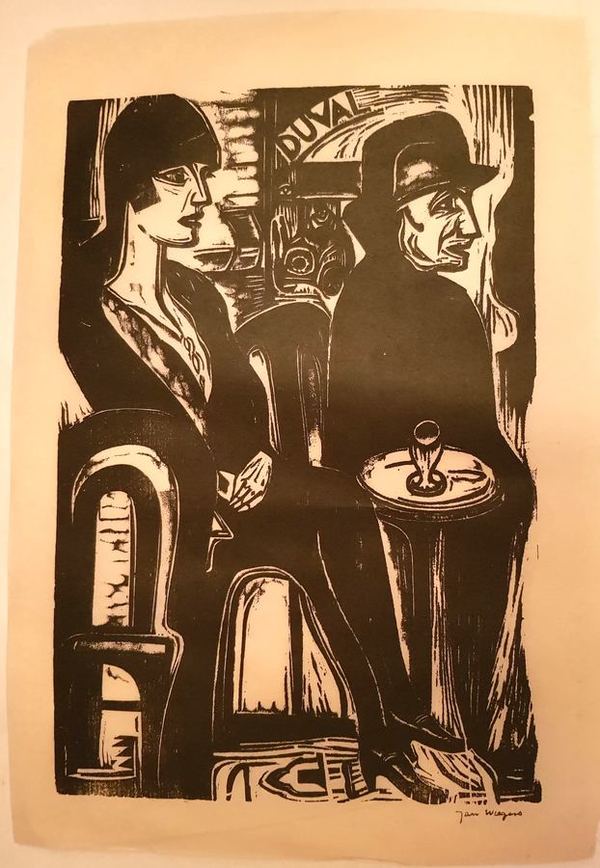 Houtsnede Cafe Duval Gedrukt op Japans papier, Posthume druk Afm 47x31 cm.