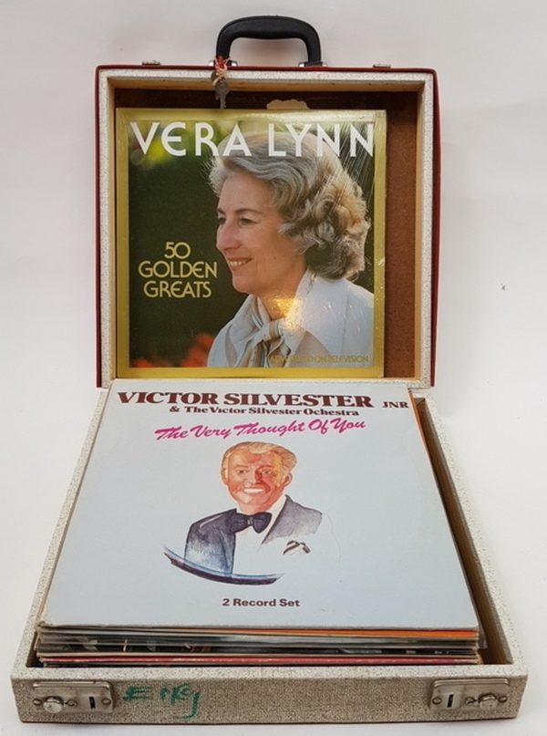 302. Elpees in koffer o.a. Vera Lynn, Victor Sylvester en Joe Loss
