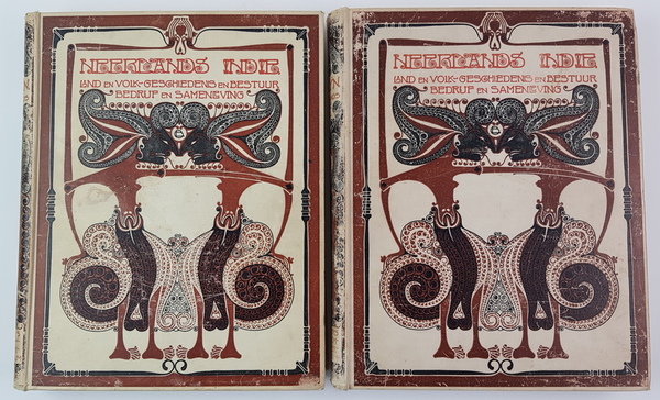 H. Colijn - Neerlands Indie. Land en Volk, Geschiedenis en Bestuur, Bedrijf en Samenleving. Amsterdam: Uitgevers-Maatschappij 'Elsevier', 1913. 2 delen, gebonden in linnen. 326 afbeeldingen in de tekst, uitvouwbare kaart achterin deel 1. Met fraai bandontwerp van de bekende Nederlandse ontwerper Chris Lebeau (1878-1945). VII, 378;