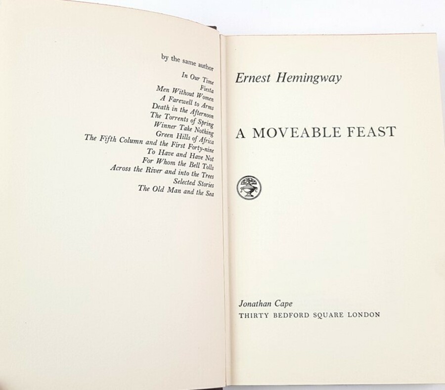 Ernest Hemingway - A Moveable Feast. London: Jonathan Cape, 1964. (1e druk). Hardcover, goudopdruk op de rug. Stofomslag manco. 192pp.