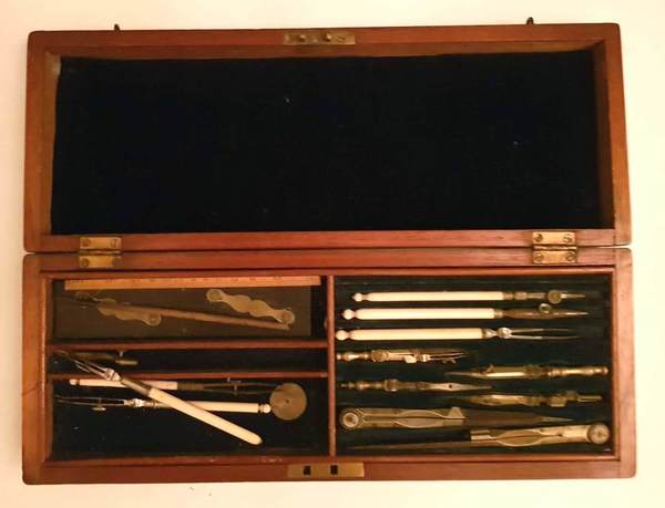 Houten kist met messing pklaatje en scharnieren, gevuld met m,essinge en benen passers en tekengerei hierbij een aantal meetlatten. Ca 1900