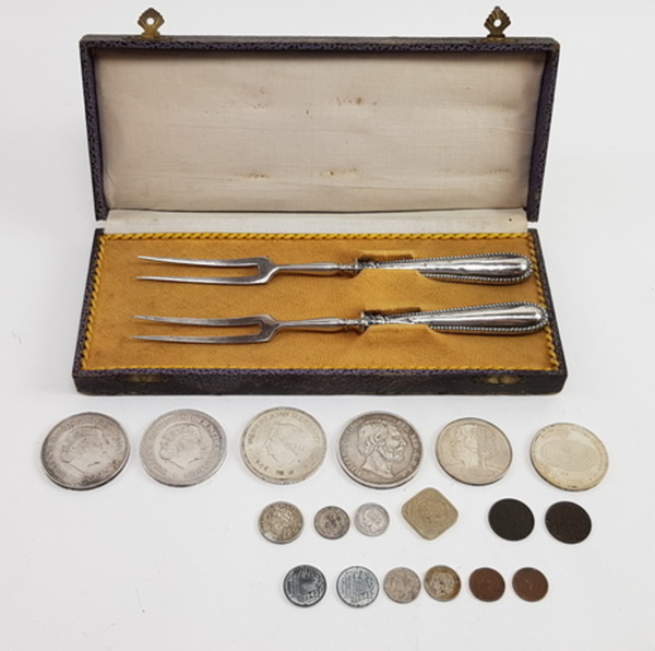 Zilver/onedel lot diverse munten + bestek 19/20e eeuw. Waaronder: 11 zilveren munten en 1 bestekdoos met 2 vleesvorken met zilveren heft ( in gebruikte conditie)