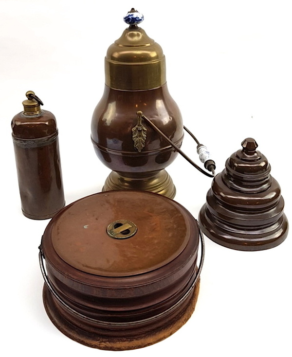 Koperen tabakspot, stoof, doofpot en een kruik 19e en vroeg 20e eeuw.