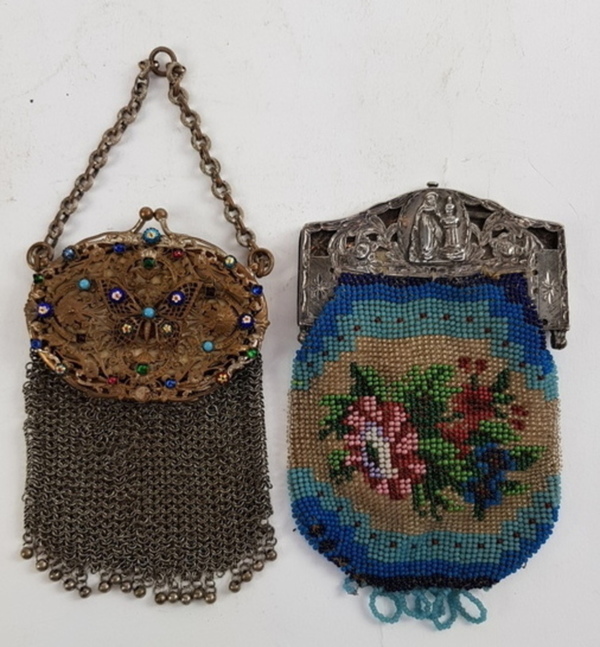 Zilver/ onedel, 2 kleine beursen 19/20e eeuw. 1 x kleine portemonnee onedel met erin een kleine spiegel. 1 x antieke kralenbeurs met zilveren beugel, 1818.