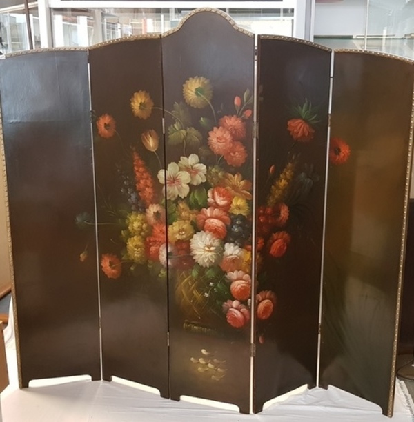 487. Houten kamerscherm met handgeschilderde bloemen, midden 20e eeuw