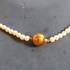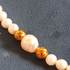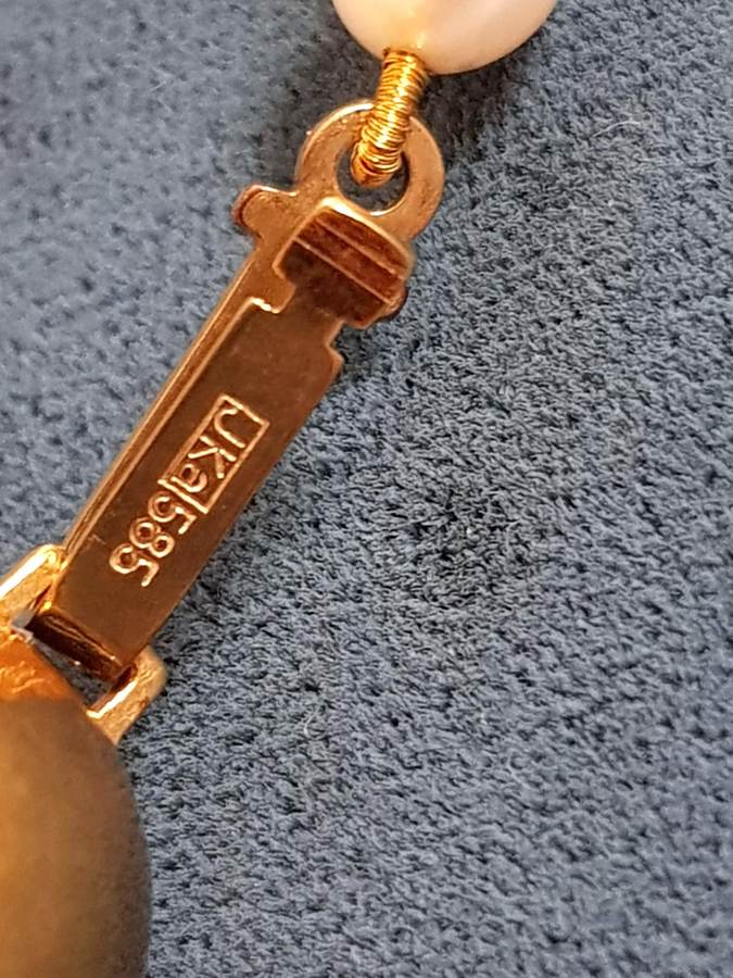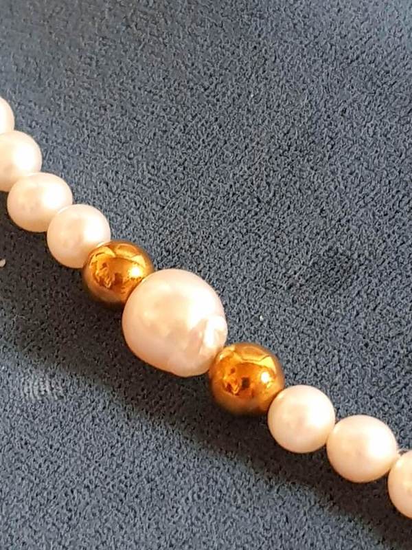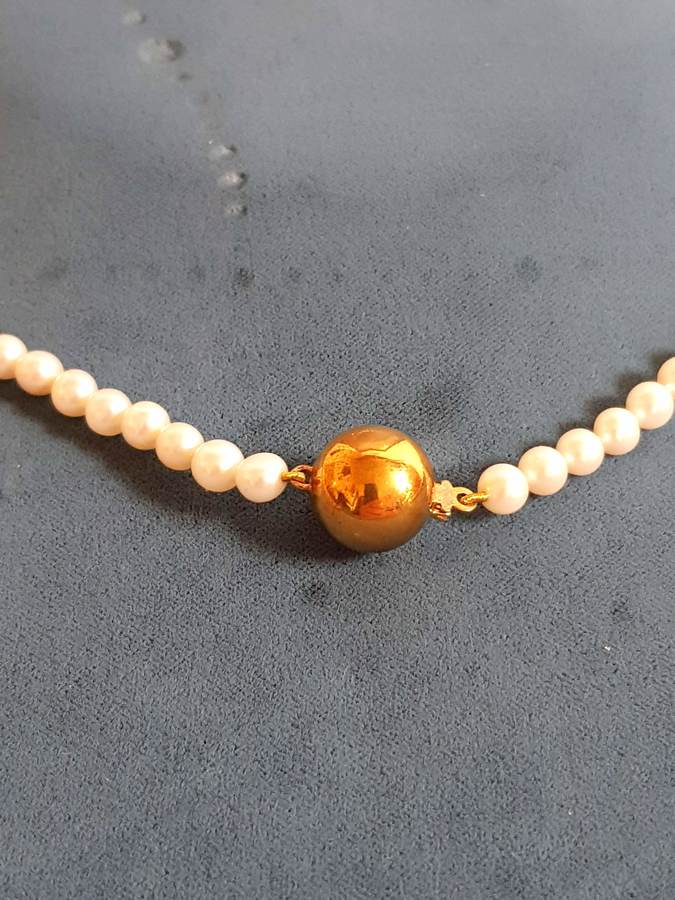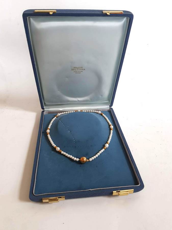 Fraai snoer met gekweekte parels met afwisselend een 14 karaats bolletje, eindigend in een een 14 karaats gouden bol sluiting. In bijhorende cassette van Frans Brugsma Groningen. |