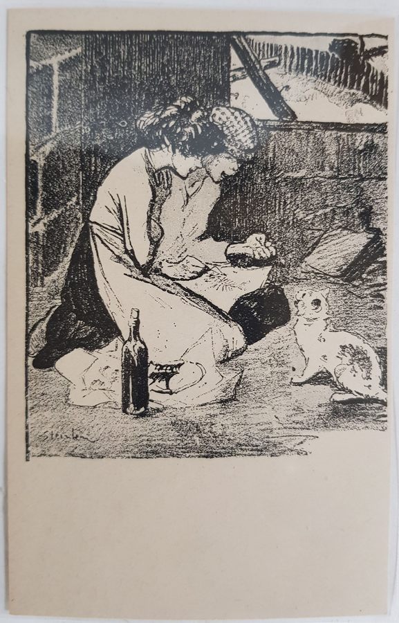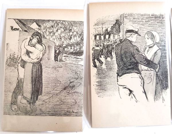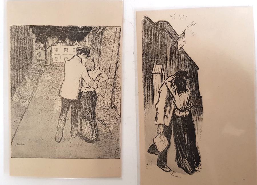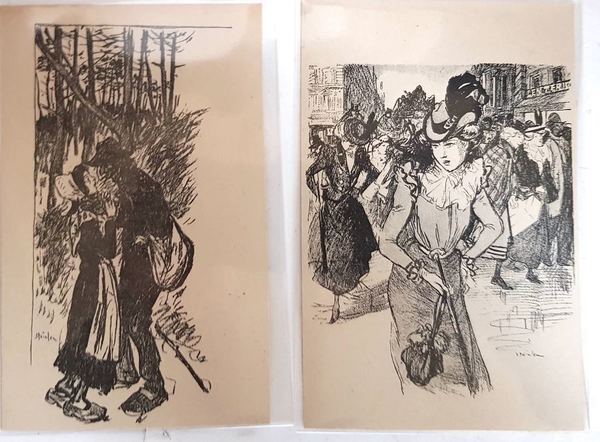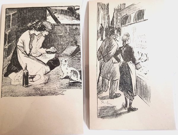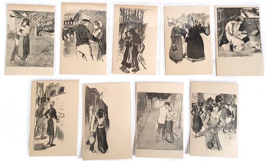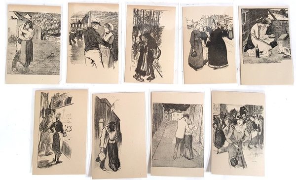 Een lot met 9 proefdrukken/Halffabrikaten van ansichtkaarten naar ontwerp van Theophile Steinlen. |