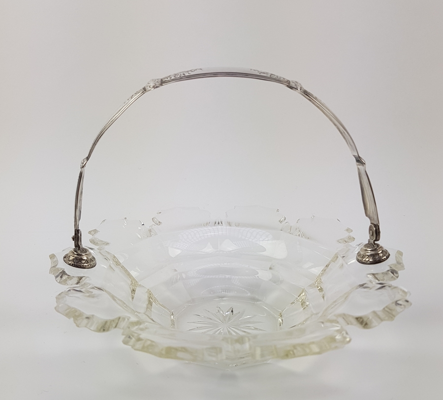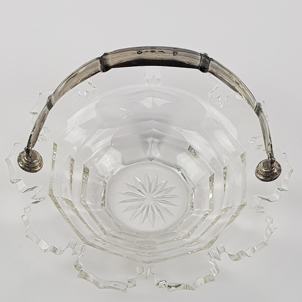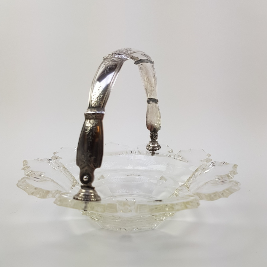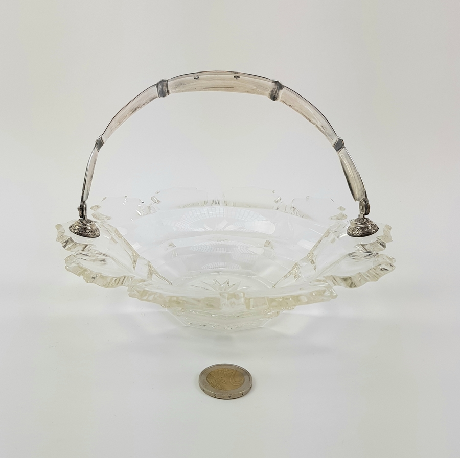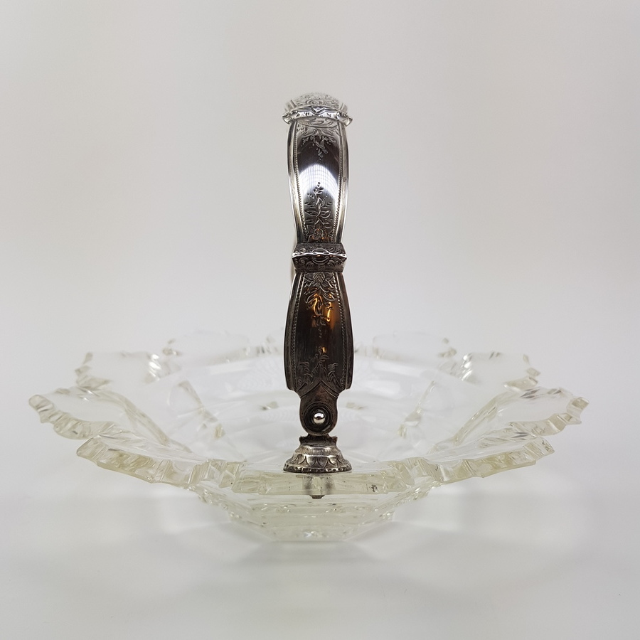 Kristal/zilver, bonbonschaal met zilveren hengsel, Nederlands 19e eeuw.