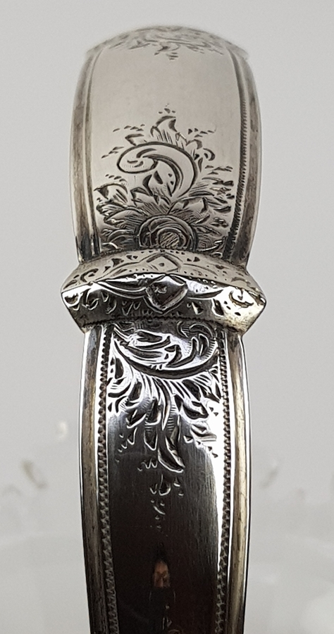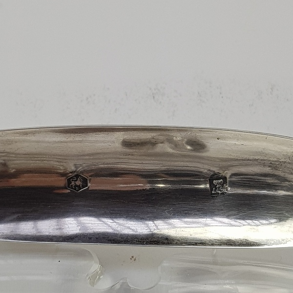 Kristal/zilver, bonbonschaal met zilveren hengsel, Nederlands 19e eeuw. Hengsel versierd met florale motieven. Gemerkt: Lopende leeuw 2, meesterteken. |