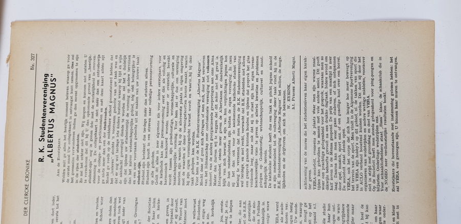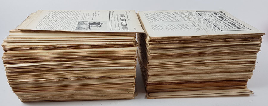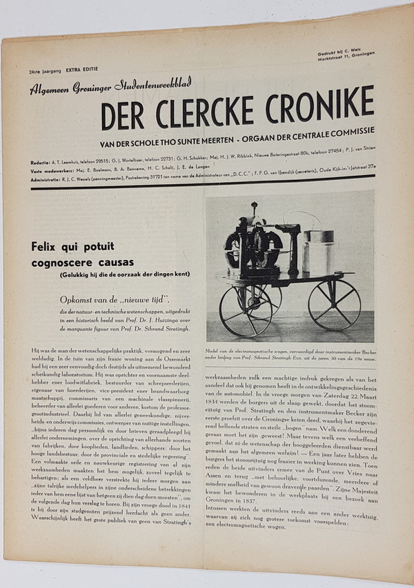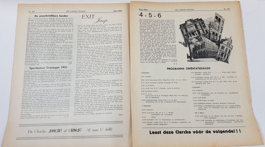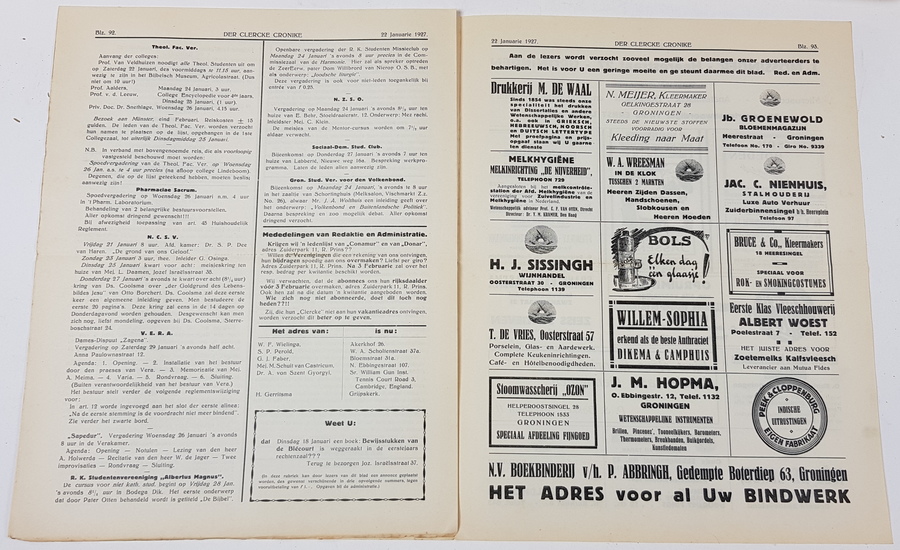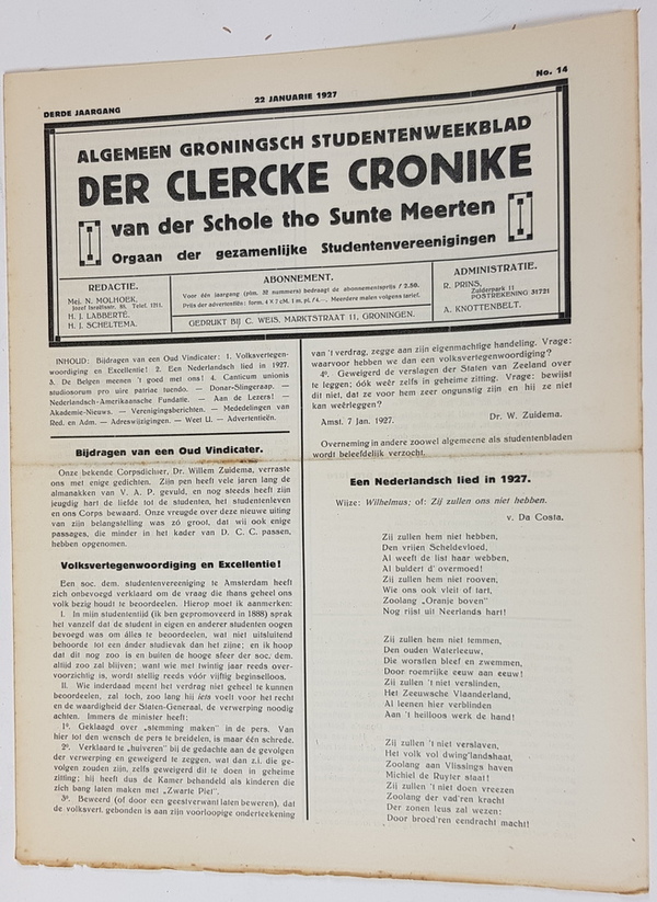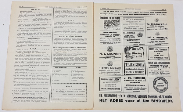 Een uitgebreid lot Der Clercke Cronike. Algemeen Groningsch/Groninger Studentenweekblad van der Schole Tho Sunte Meerten. Redactie: A. T. Leemhuis e.v.a. Honderden losse (niet ingebonden) nummers uit 1927 tot eind jaren '50 (niet gecollationeerd, 2 stapels van ruim 20 cm hoog). Met vele advertenties van Groningse bedrijven in de bladen. |