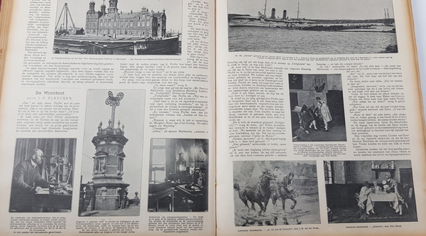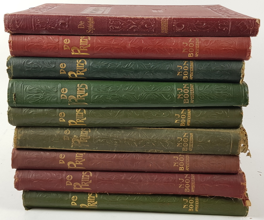 Een lot met 8 jaargangen van het tijdschrift de Prins der Geillustreerde Bladen (1907/1925). Vele afbeeldingen in zwart-wit in de delen. Hierbij De Spiegel, Jaargang 4 (1909). [Totaal: 9]. |
