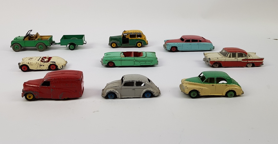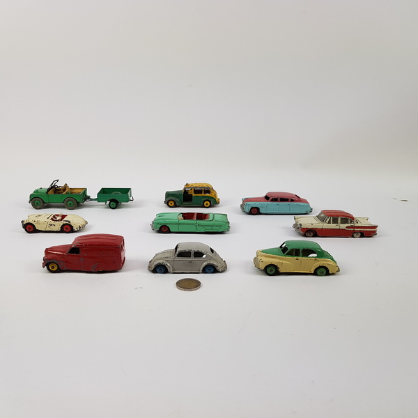 Metalen auto's, Dinky Toys Meccano Ltd, eerste helft 20e eeuw, 9 stuks ( een met aanhanger = 10 pcs ) |
