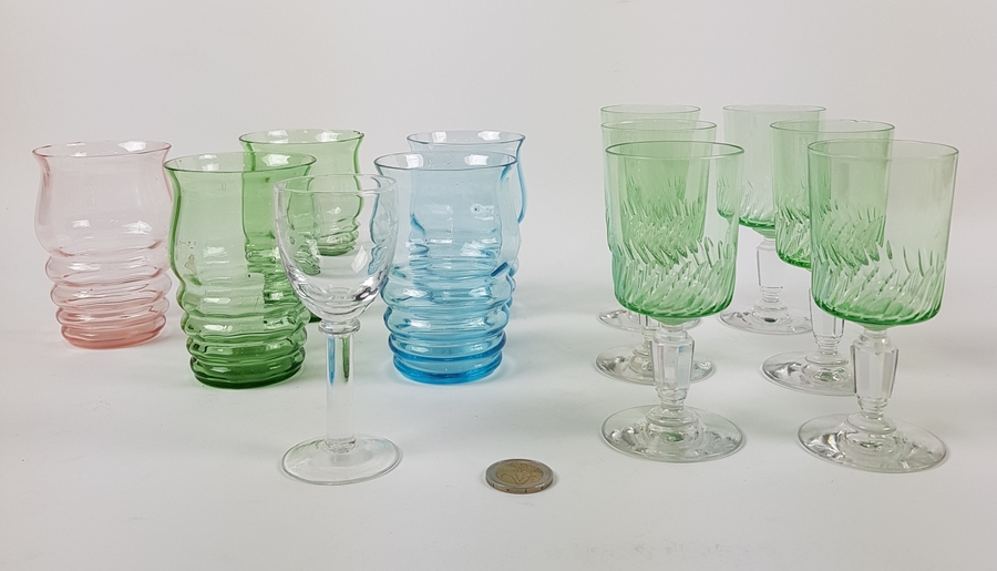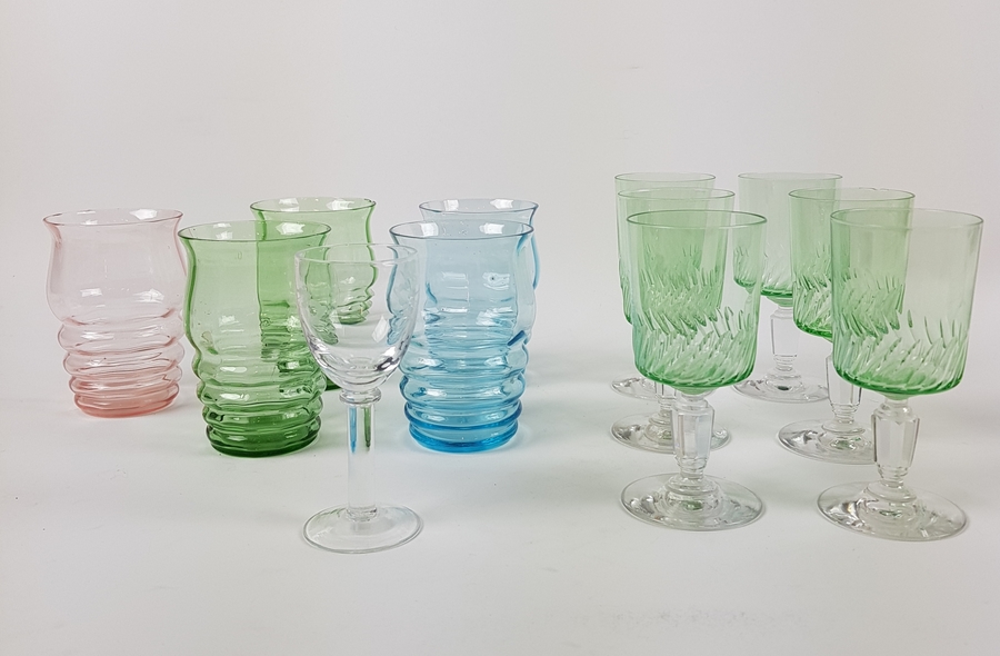 Glas, lot divers gekleurd glaswerk, 1e helft 20e eeuw. Bestaande uit: set van 6 wijnglazen, 5 drinkglazen en 1 borrelglas. |