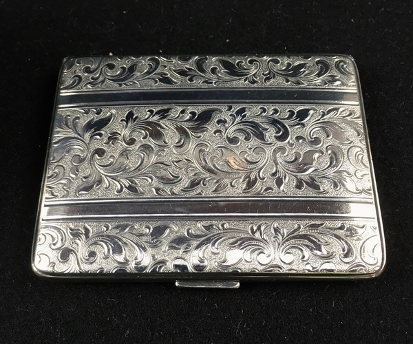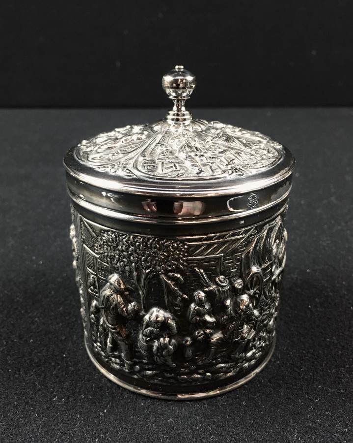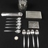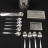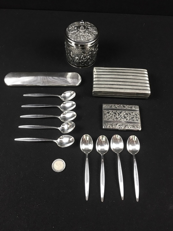 Plate/alpacca, lot van 7 stuks waaronder een brillenkoker, 19/20e eeuw. Bestaande uit: Brillenkoker, tabaksdoos, sigarettencase, 9 theelepels en een tabakspot. |
