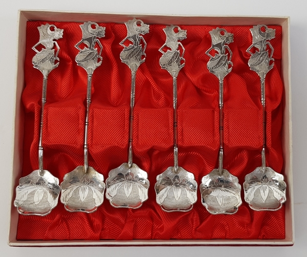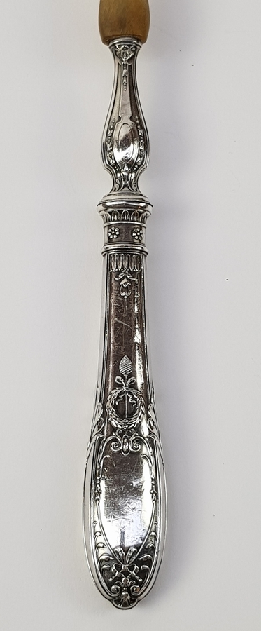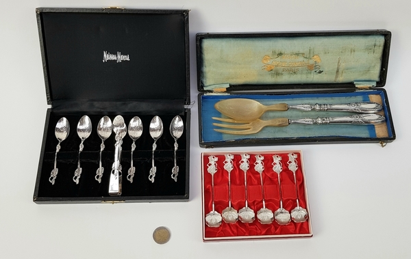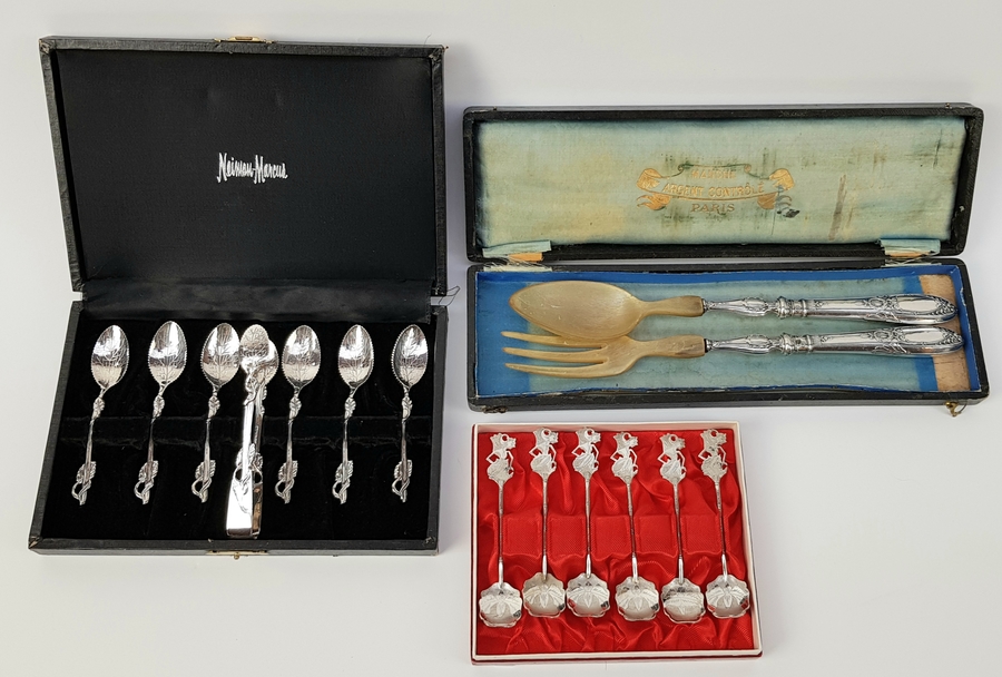 Zilver/ verzilverd, Divers lot bestek, 1e helft 20e eeuw. Bestaande uit: Sla couvert zilver (manche argent controle Paris), theelepels zilver , theelepels met suikertang verzilverd (Neiman Marcus). Alle 3 in bijbehorende doos. |