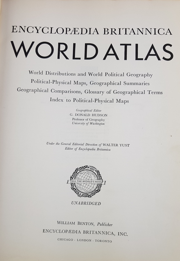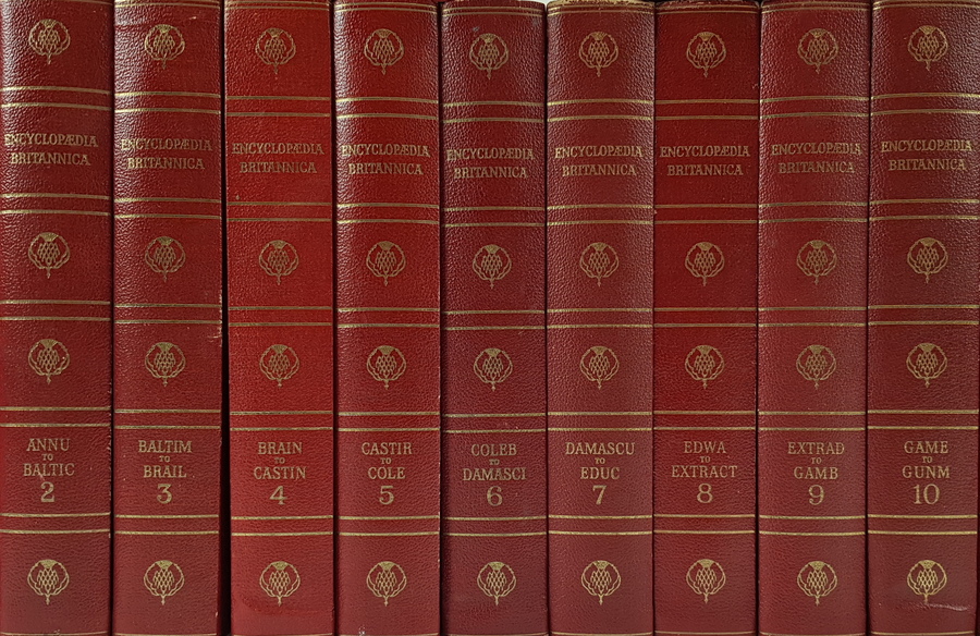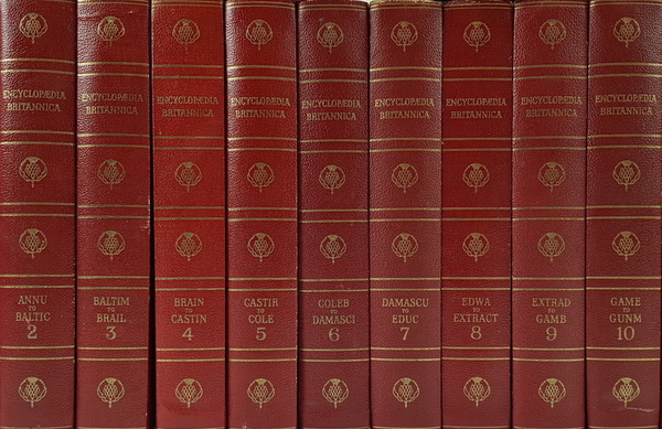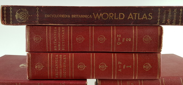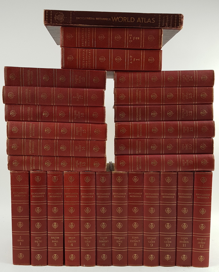 Encyclopaedia Brittanica. 24 delen (inclusief indexdeel). Chicago etc.:Encyclopaedia Brittanica, Ltd, 1961. Hierbij de Brittanica World Language Dictionary (uitg. 1960); de World Atlas (folio, uitg. 1960). Uniform gebonden in kunstleer. Uitgebreid naslagwerk. |
