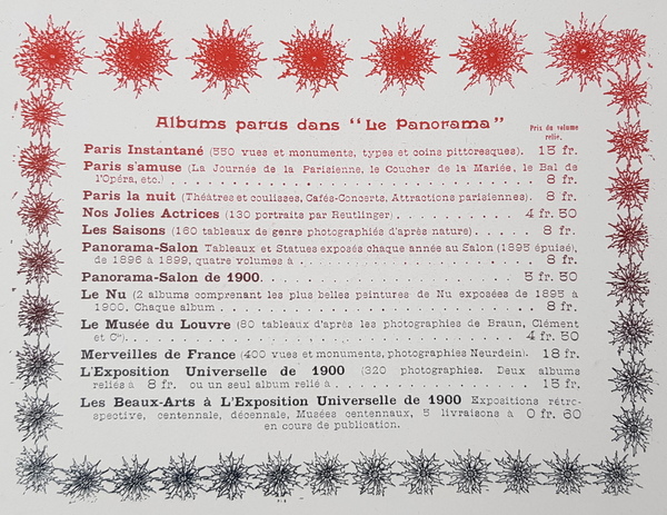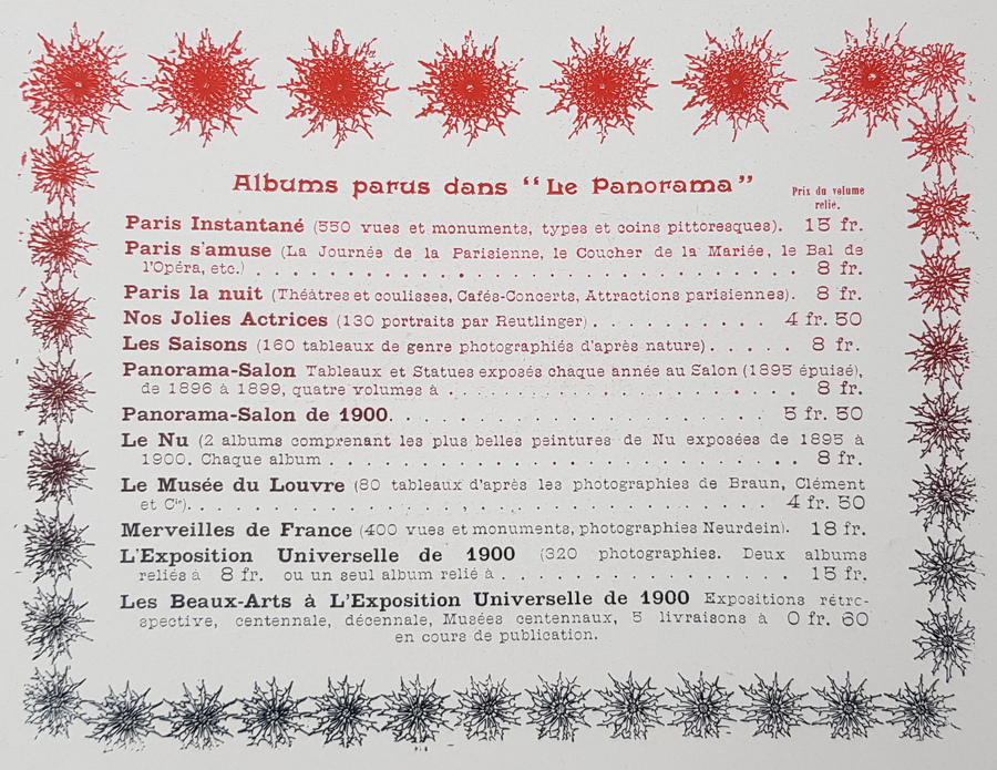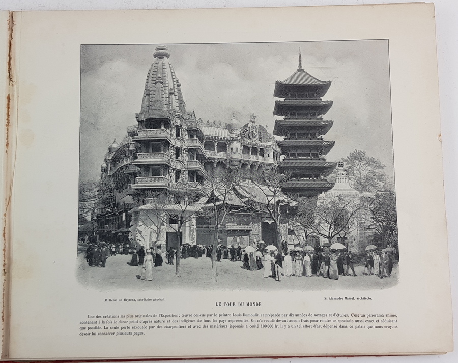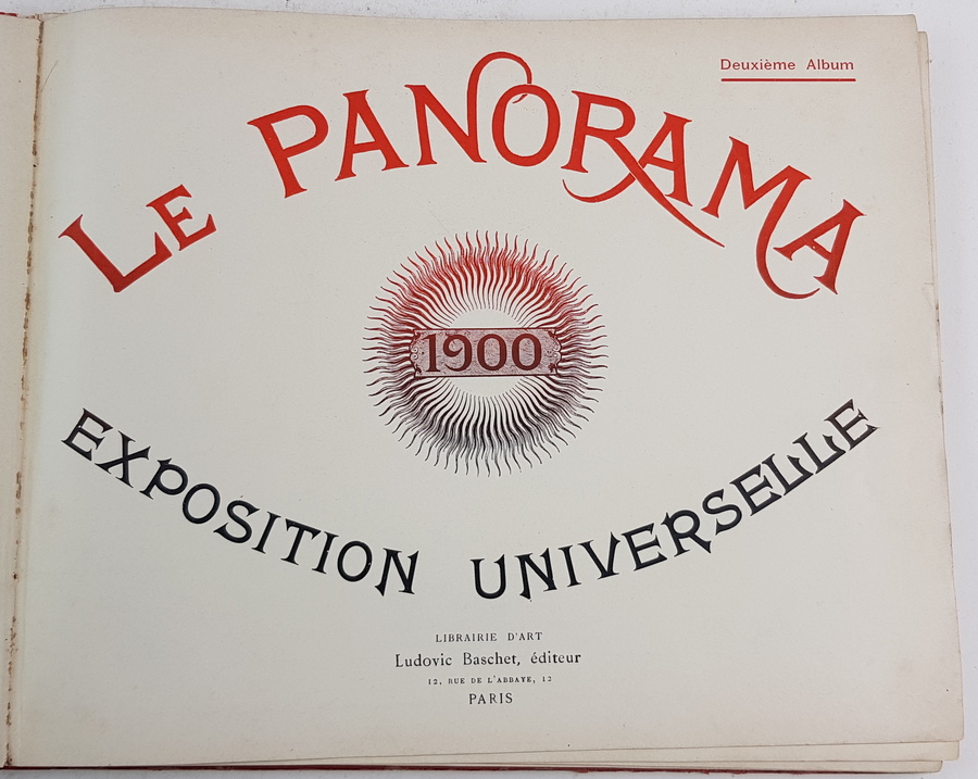 Neurdein Frères (fotografie) - Le Panorama. Exposition Universelle. Parijs: Librairie d'Art, Ludovic Baschet, 1900. Ca. 150pp, ongepagineerd. Oblong, gebonden in rood linnen met goudopdruk op het voorplat. Vele afbeeldingen in het binnenwerk van de Exposition Universelle in Parijs in 1900. |
