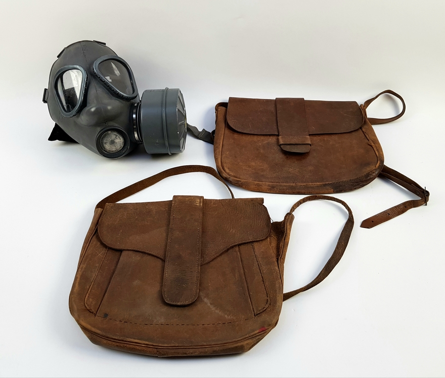 Metalen gasmasker en leren tassen, Europa, 20e eeuw