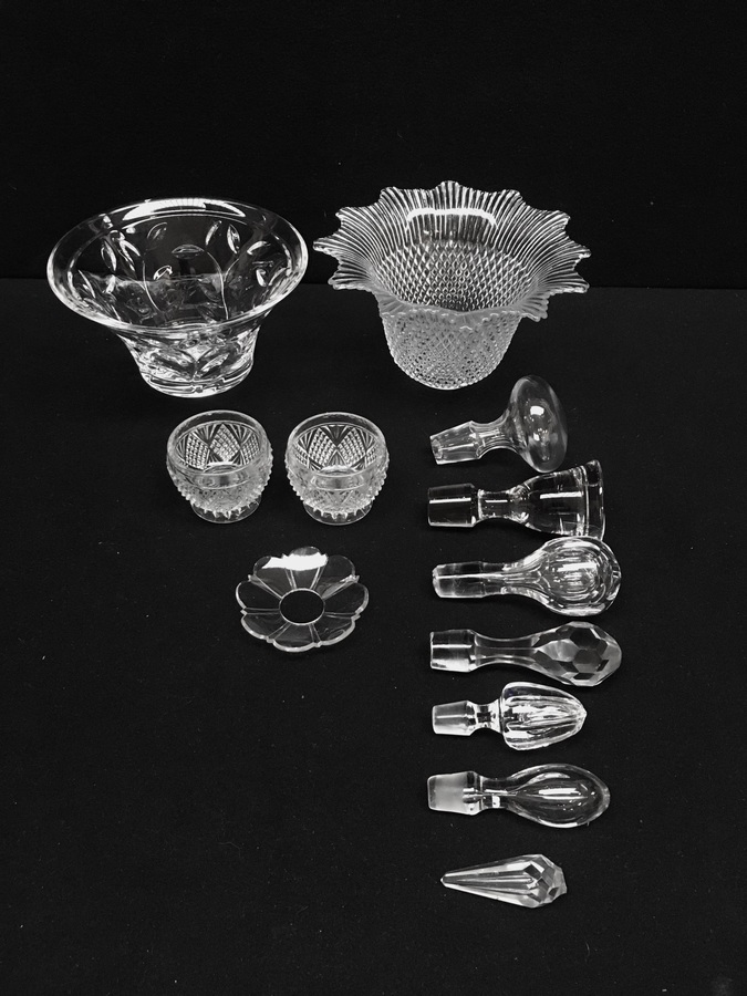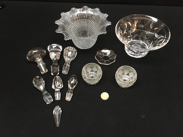 Kristal/glas, lot van 12 stuks waaronder 7 karaf/fles stoppen, 19/20e eeuw. Bestaande uit: Twee schalen, zeven stoppen, druppelvanger en twee glaasjes. |