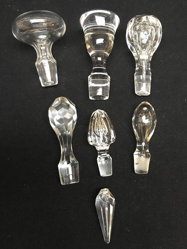 Kristal/glas, lot van 12 stuks waaronder 7 karaf/fles stoppen, 19/20e eeuw.