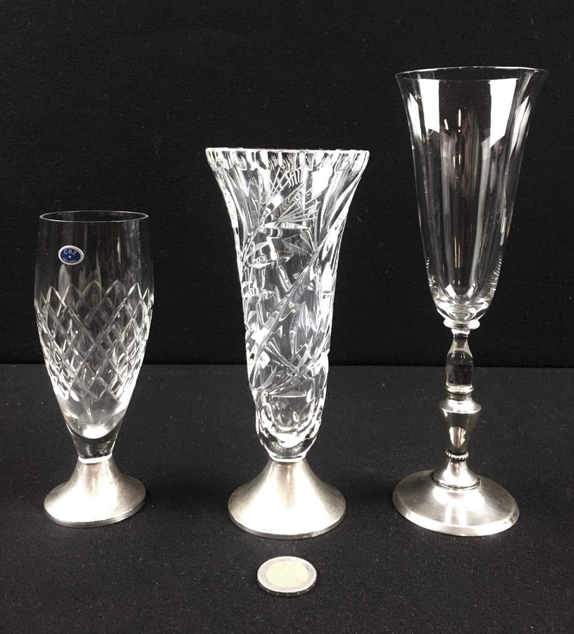 Kristal, drie flutes / glazen met zilveren voet, midden 20e eeuw