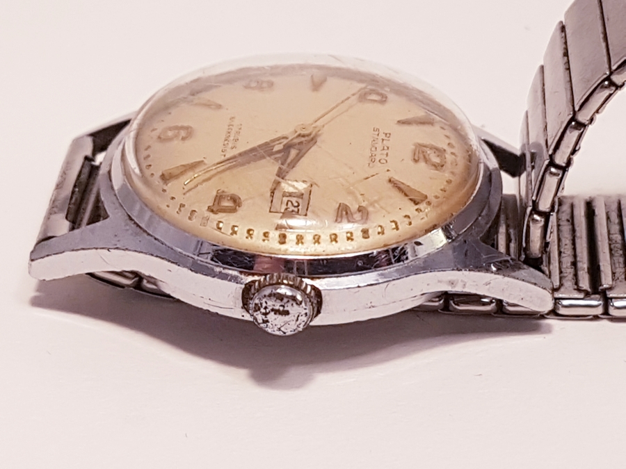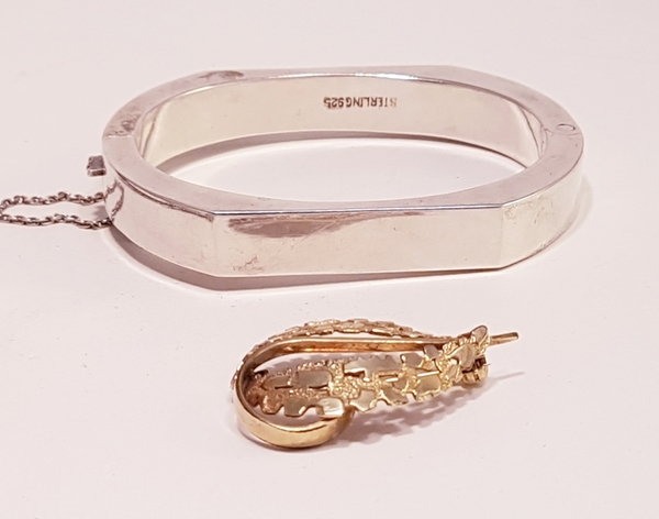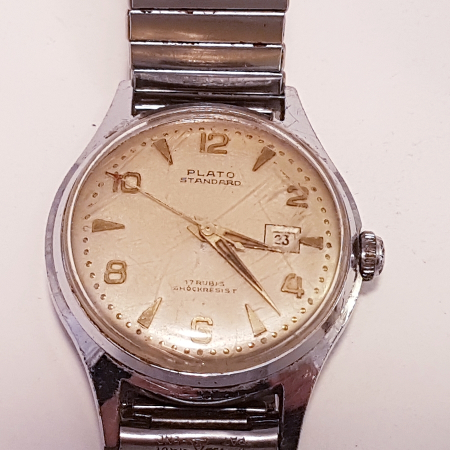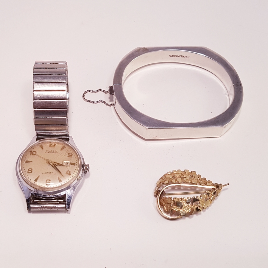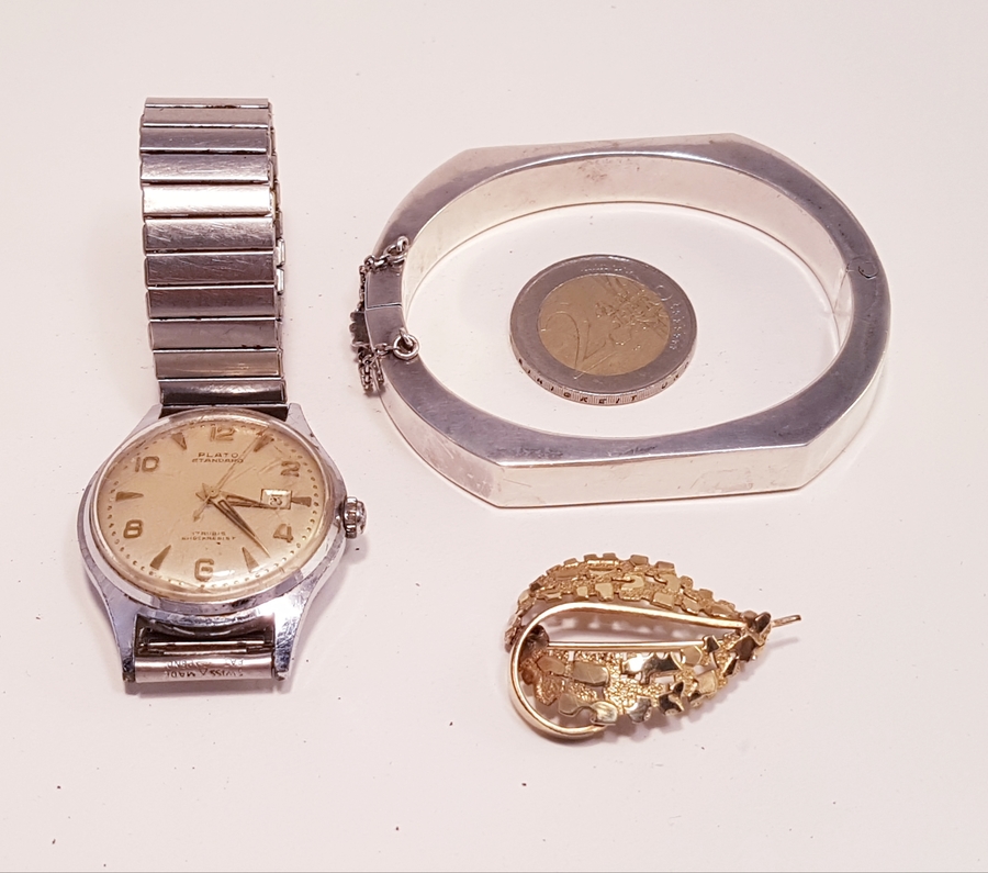 Zilver/ doublé/chroom, Lot van 3 stuks: Horloge, broche en armband. 19e/midden 20e eeuw. A. Herenhorloge van het merk Plato. Werkend, kast( chroom) in gebruikte conditie en glas gekrast. B. Een zilveren armband, gemerkt: 925 sterling ( 925/1000 zilver) in goede conditie met gebruikssporen. C. een zogenaamde Amerikaner gold ( Doublé/ vergulde) broche. In goede conditie. |