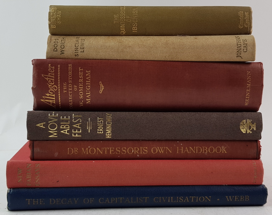 Ernest Hemingway - A Moveable Feast. London: Jonathan Cape, 1964. (1e druk). Hardcover, goudopdruk op de rug. Stofomslag manco. 192pp. 8vo (20x13 cm). Hierbij 6 andere titels in het Engels, veelal literatuur. [Totaal: 7]. |