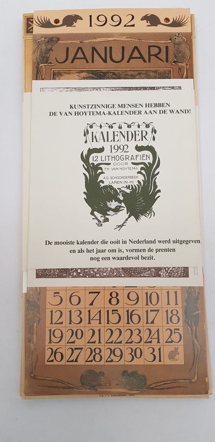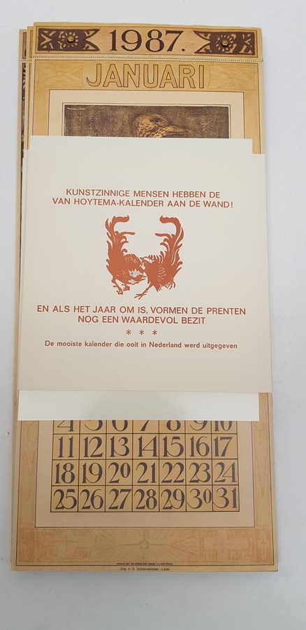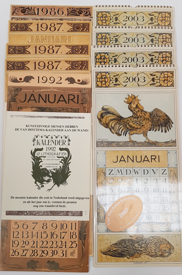Een lot met 9 Hoytema-Kalenders: 1986; 1987 (3 ex.); 1992; 2003 (4 ex). Heruitgave in facsimile van uitgeverij Schoonderbeek, Laren van de originele kalenders van Hoytema, uitgegeven aan het begin van de 20e eeuw. 12 lithografieen per kalender. [Totaal: 9]. |