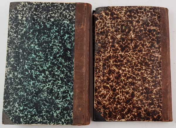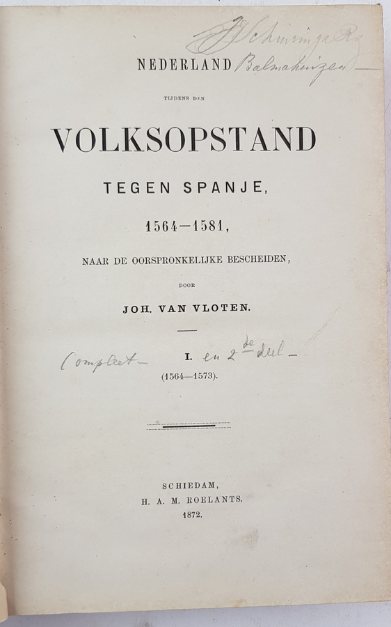 G. Valette - Baren en Oudgasten. Indische Schetsen. 's-Gravenhage: Henri J. Stemberg, 1880. Gebonden in halfleer met gemarmerde platten. 218pp. Hierbij: Joh. van Volten - Nederland tijdens den Volksopstand tegen Spanje, 1564-1581, naar de Oorspronkelijke bescheiden. 2 delen in 1 band. Schiedam: H. A. M. Roelants, 1872. Gebonden in halfleer met gemarmerde platten. [Totaal: 2]. |