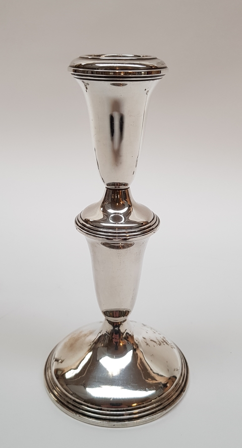 Zilver, Lot van 3 stuks kandelaars. 1e helft 20e eeuw. Bestaande uit een grote kandelaar gemerkt: Reed & Barton weighted ( verzwaard) en twee kleinere kandelaars tevens verzwaard en 1 gemerkt: Klein zwaard. |