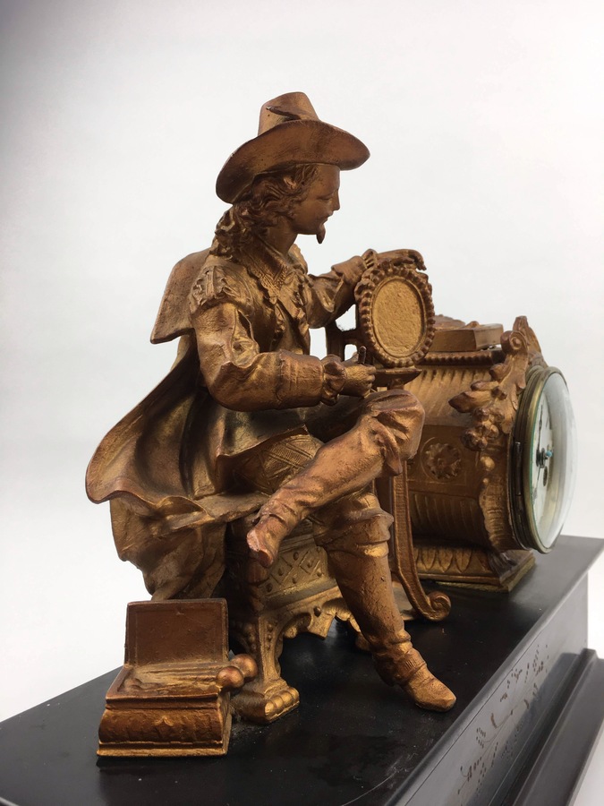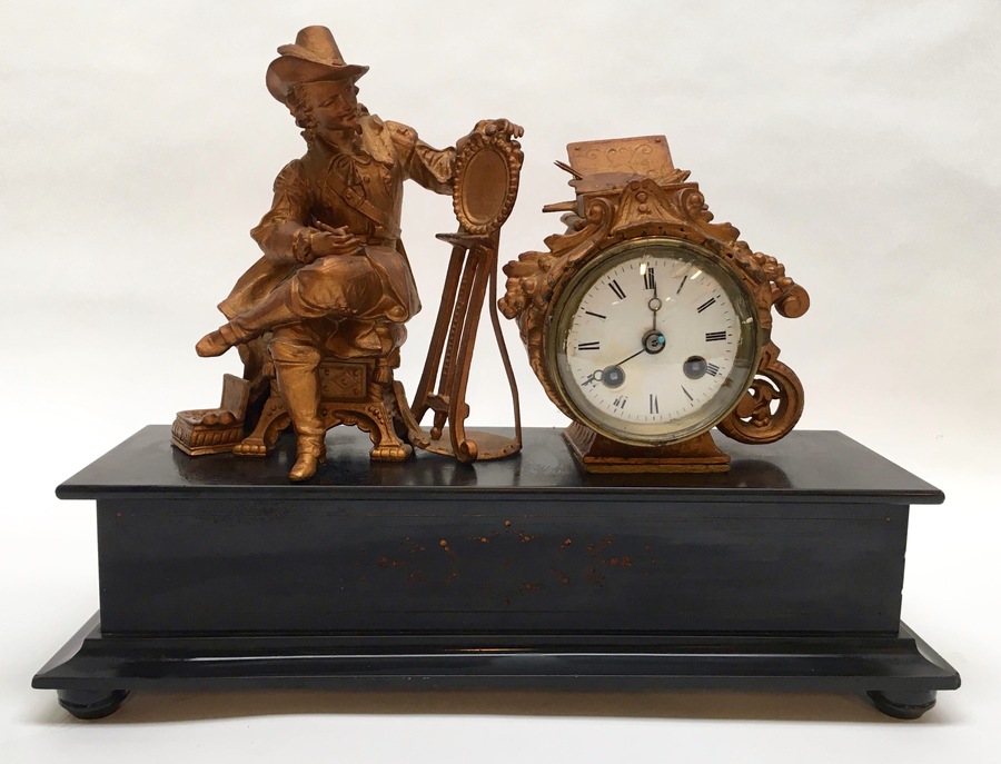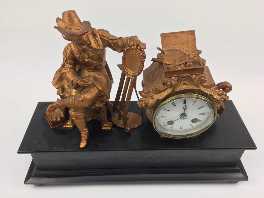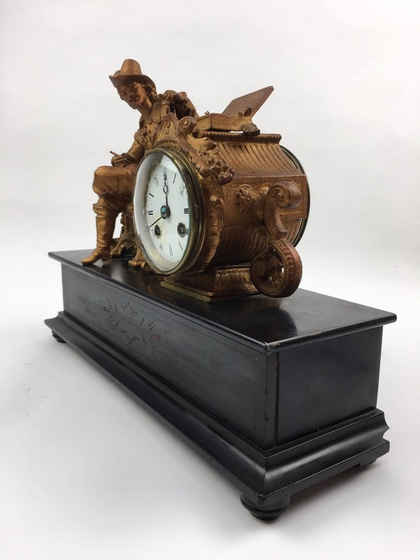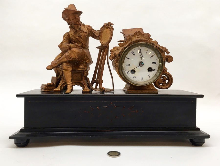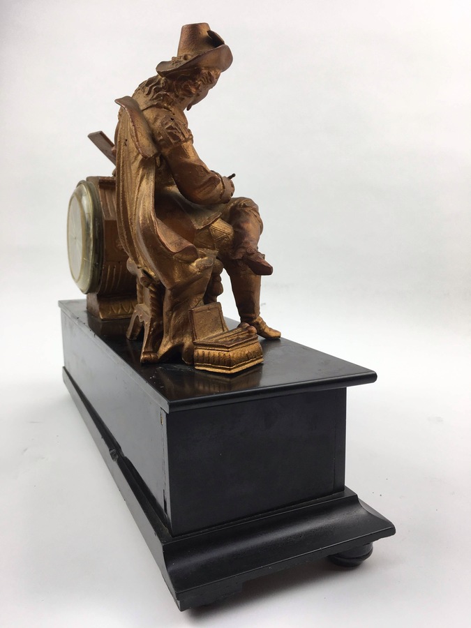 Zamac klok met een figuur op marmeren voet, Frankrijk, 19e eeuw