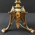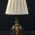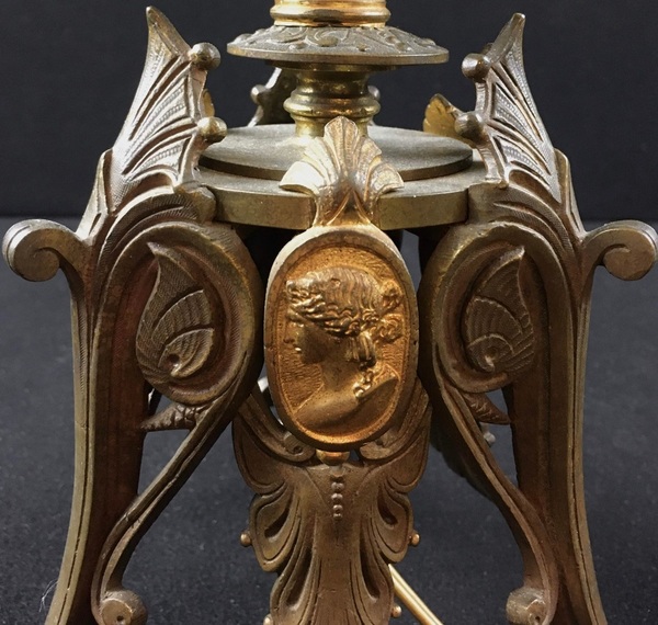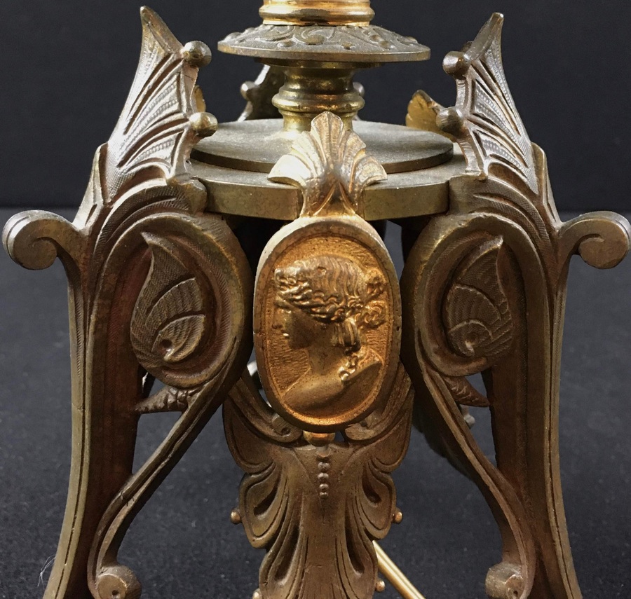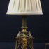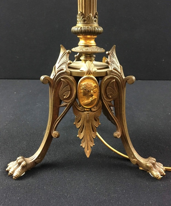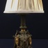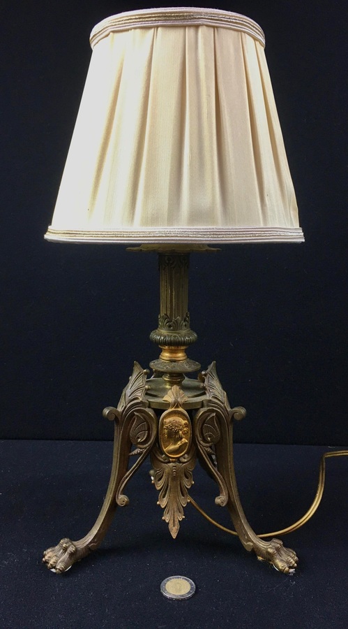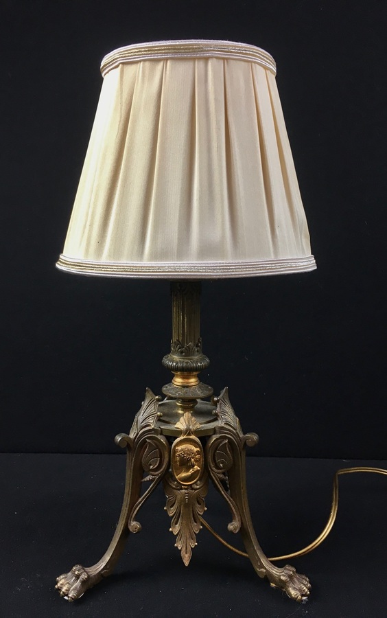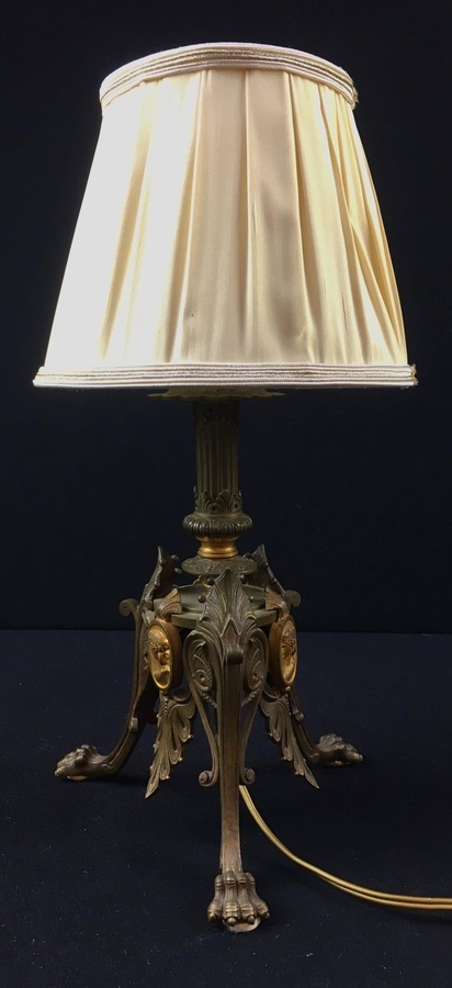 Brons, lamp met geplooide stoffen kap, rond 1900. De voet staat op klauwpoten en versierd met medaillon. |