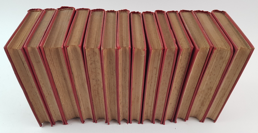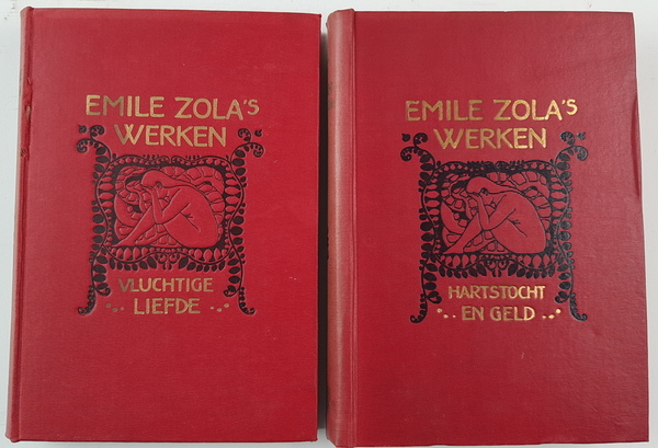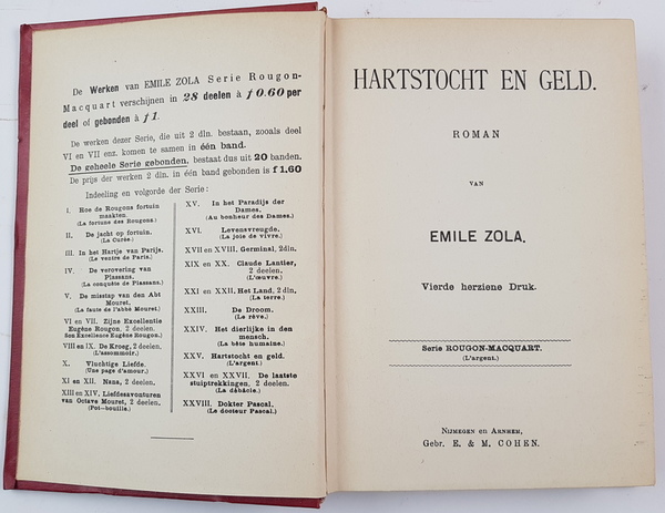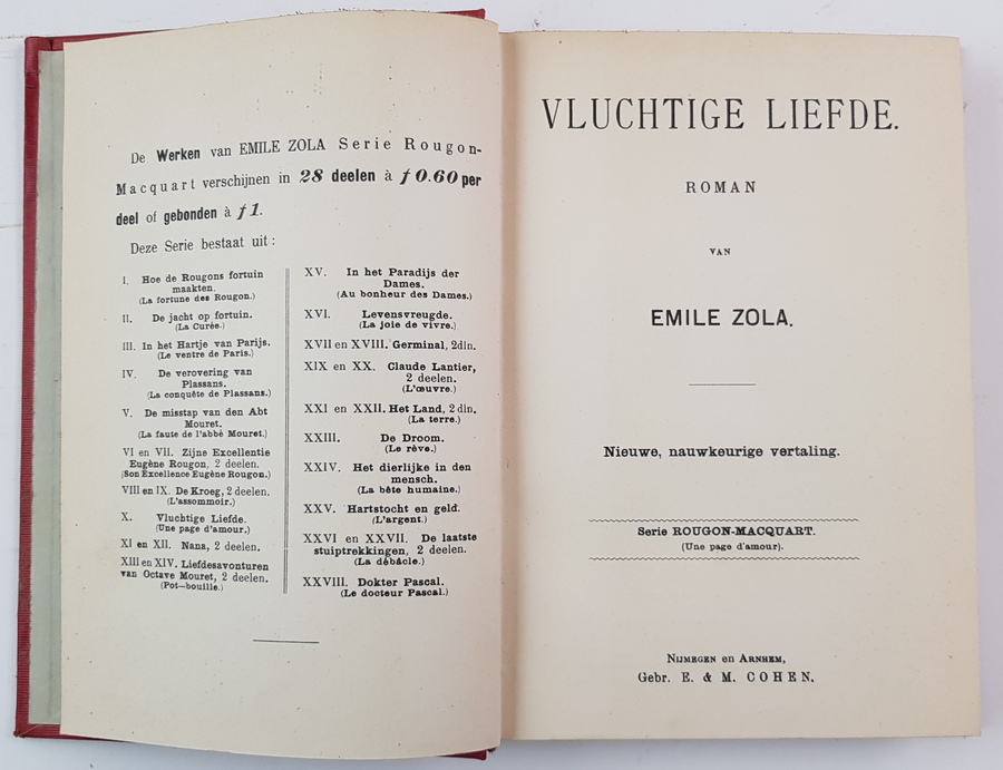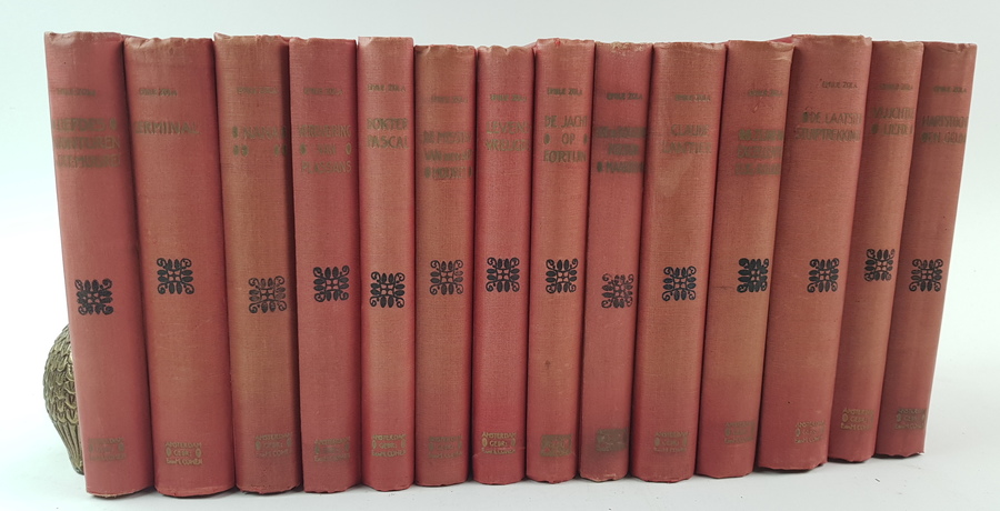 Emile Zola - Emile Zola's Werken. Serie Rougon-Macquart. 14 delen (incomplete serie). Nijmegen en Arnhem: E & M Cohen, z.j. Uniform gebonden in rood linnen. Ca 300-400 pp. per deel. 8vo (20x14 cm). |