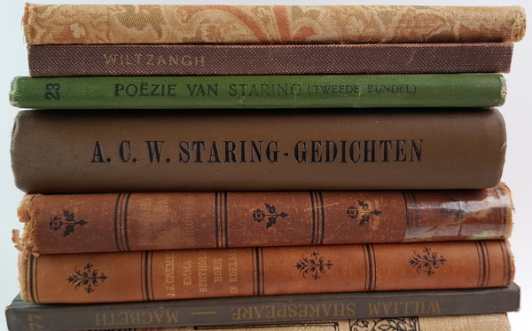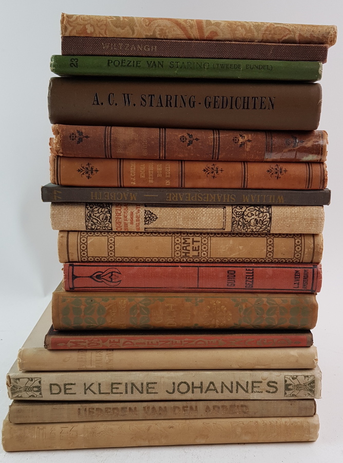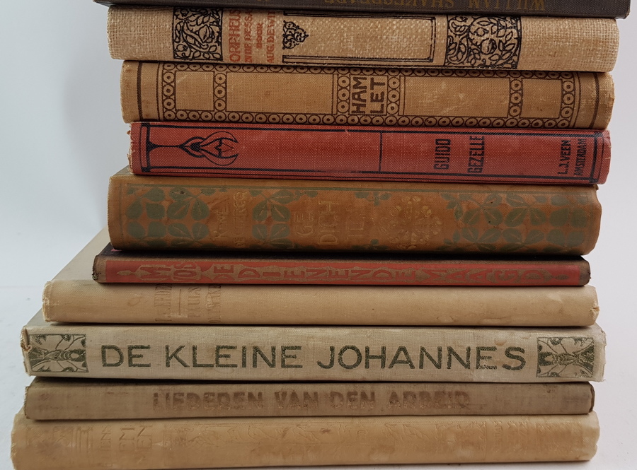 Een divers lot boeken, veelal op het gebied van literatuur en poezie. Een aantal boeken in een fraaie Art Nouveau/Art Deco boekband. Onder andere met titels van Guido Gezelle en A. C. W. Staring. [Totaal: 16]. |