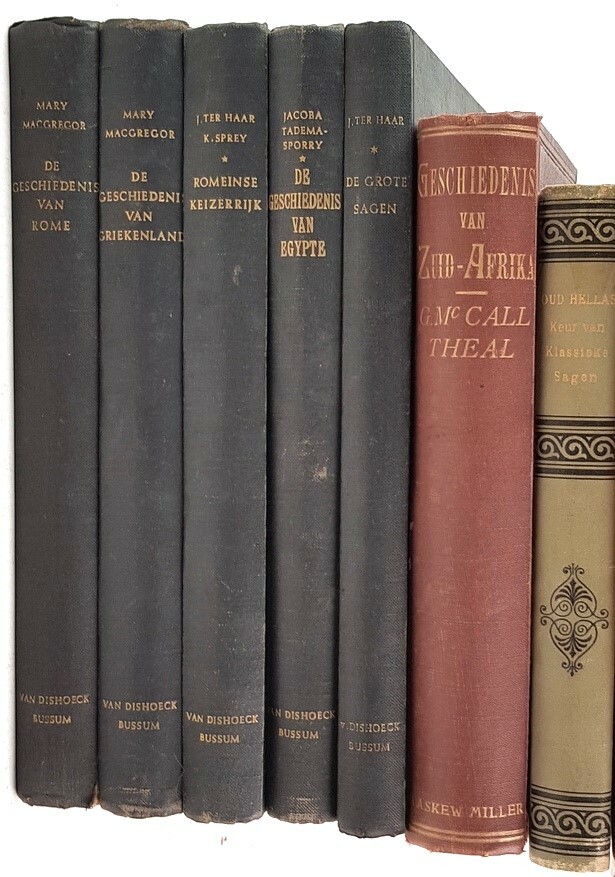 Een lot boeken van zeven boeken met betrekking tot geschiedenis, waaronder G. McCall Theal - De Geschiedenis van Zuid-Afrika en enkele boeken over Griekse en Romeinse geschiedenis. |